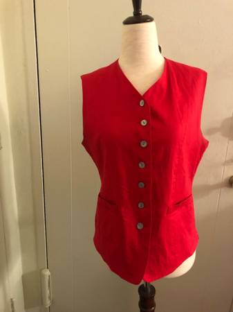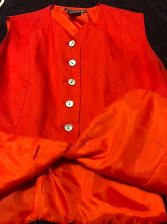 Vintage women’s Silk Club red linen vest, size M. The vest is fully lined and has 2 pockets and 2 back slits. It is in good condition with very faint stains under the armholes.