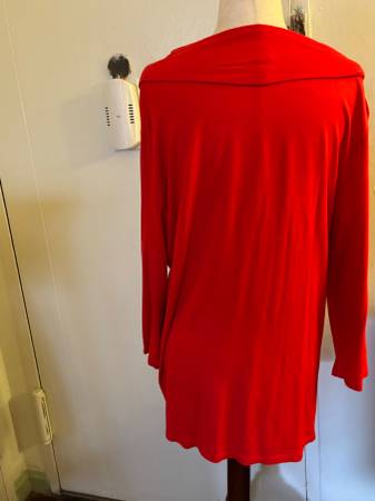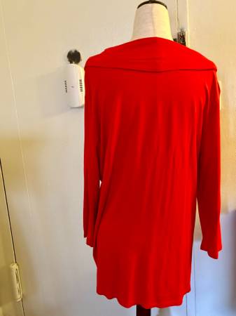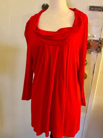 Women's Kenneth Cole red tunic with cowl neck, size L (approximately 29" from shoulder to hem, approximately 21" from armpit to armpit), 95% rayon, 5% spandex, in good condition with some pilling