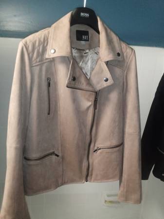 like new women's size large black leather mc jacket by all saints $150 like new women's size large tan faux suede mc jacket by kut $75 thompson and bleecker street. doorman bldg. till 10 pm nights ok.