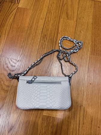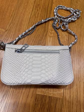 Removable chain strap, 12" drop Dimensions: 10.6"W x 5.1"H Magnetic snap closure Exterior zip pocket, interior zip pocket Silver-tone hardware Python-look embossed leather Lined Embossed Leather...