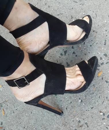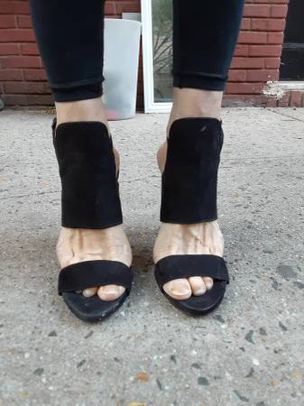 Black suede, size 40 (approx. size 9 equivalent). Beautiful, barely worn (fashion show only), sophisticatedly sexy strappy heel, but supportive and comfortable for the heel height. Make your legs look like legs-for-days! Gives height and elegance. Perfect multi-season shoe with substantial straps and black suede fabrication. Stylish, sturdy. SERIOUS inquiries for purchase ONLY. No foot fetishist requests allowed. DO NOT RESPOND with foot-kink inquiries.