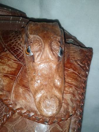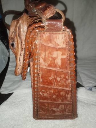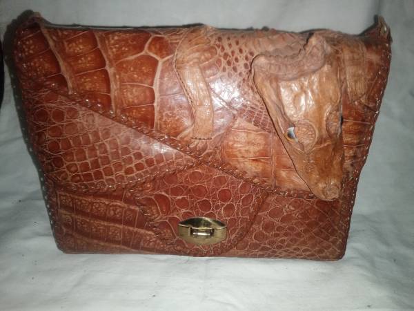 The image displays a vintage handbag made from genuine alligator or crocodile leather, featuring the head of the reptile on the flap.