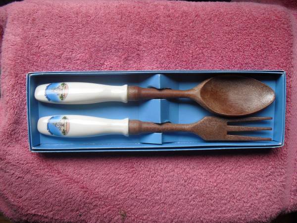 Wooden salad fork and spoon from Walt Disney World in Lake Buena Vista, Florida. The set was purchased in 1972, in original box, never used.