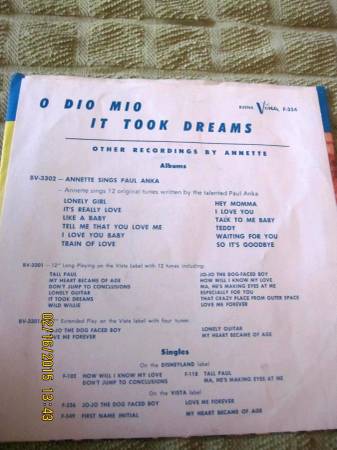 O Dio Mio, It Took Dreams, 45 rpm record & sleeve, by Annette, Walt Disney Productions, record & sleeve in excellent condition except for a name on both