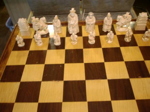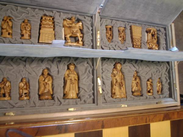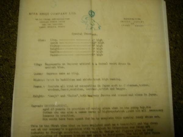 Hakonezaiku hand carved Antique Ivory Chess Set. My uncle was stationed in Okinawa 1946-1950 (approximately) where (I believe) he bought this chess set. There is no date on the pictured letter, but it reads "Kita Shoji Company, LTD., Tokyo, Japan." My aunt gave me this chess set about 20 years ago. As you can see the carrying case is in rough condition but could be copied. The wooden board has wear on it but it is in 99% excellent condition and measures 24" X 24" X 4 1/2" (inches). All the chess pieces are immaculate. They are truly beautiful hand crafted with not a mark on them after 70+ years. I hope you can see the detail of the carving in the attached pictures. View it on a larger screen so that you might see the intricate detail and to read the letter. $95,000.00 USD in cash or certified funds. OBO 2one4-2three6-9two6nine.
