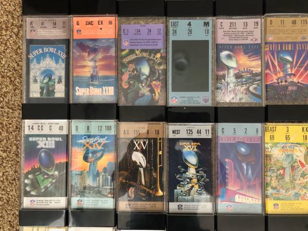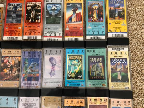 This is a rare opportunity to purchase Super Bowl ticket stubs 1 and numbers 5 through 57. Ticket stubs are all in very good to excellent condition. All tickets are in beautiful clear Lucite blocks...