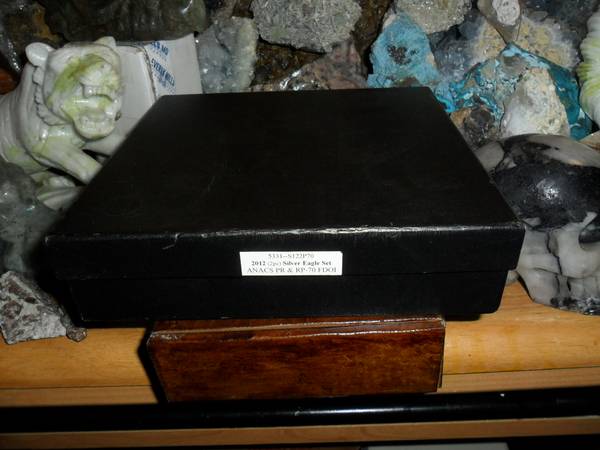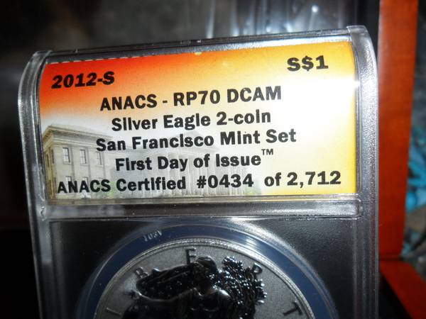Exceptional and Beautiful 2012-S $1 American Silver Eagle 2 Piece-Coin Set San Francisco Mint Set ANACS PR70 First Day Of Issue Silver Proof and Reverse Proof. Comes in like new Display Case Plastic Never Removed off of Window of Wooden Case and outer Box. Original Owner. Exceptional Set out of My Collection. ANACS Certified #0434 of #2,712 Pictures Show You All Angles of This Beautiful Coin Set. Price: $395.00 Handling and Shipping $25. 00 The Best of the Best. Visit: www.paulsgems.com