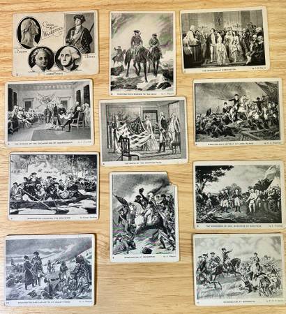 Vintage postcard set featuring portraits by J.A. Houdon, C.W. Peale, and Gilbert Stuart. This is an almost "Complete" Set of 23 Antique 19th Century Postcards. Almost "complete" in that I can't find any information on how many cards in total were in the original set. The images on the cards appear to be black and white reproductions of famous paintings from the Revolutionary War era.