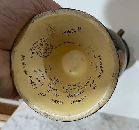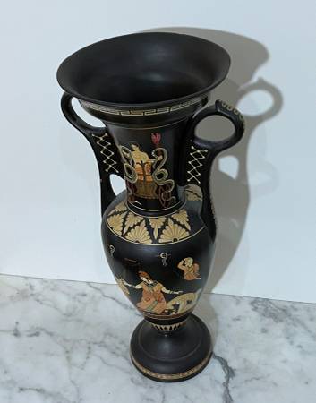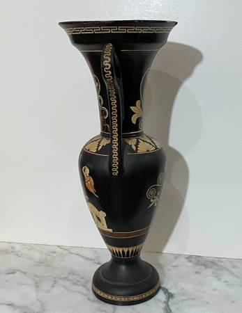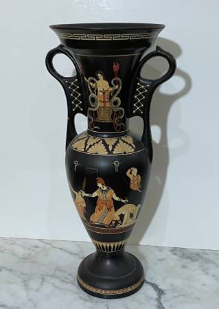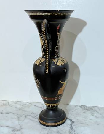 BEAUTIFUL VINTAGE SIGNED HAND PAINTED GREEK POTTERY DECORATIVE VASE 14" 1/2 tall 6" 5/8 wide 6" 6/8 diagonal at the top CONDITION: A couple of spots with tinny painting losse on the top edge, as...