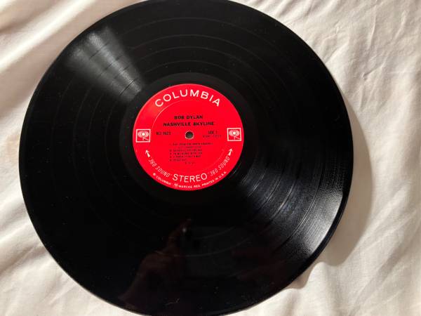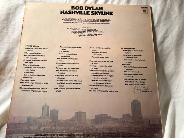Bob Dylan Nashville Skyline Vinyl (1969) in original plastic sleeve and cover. The records are is in very good condition with some minor scratches. The cover has a torn bottom and some scratches....