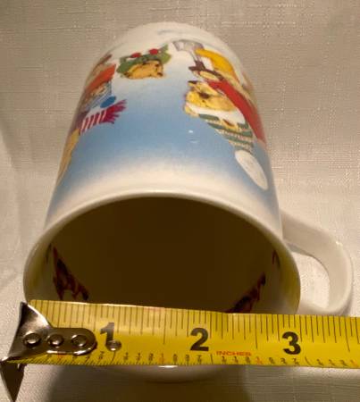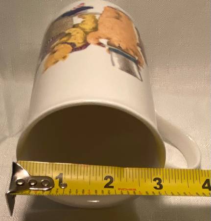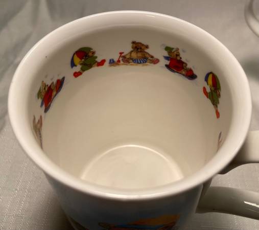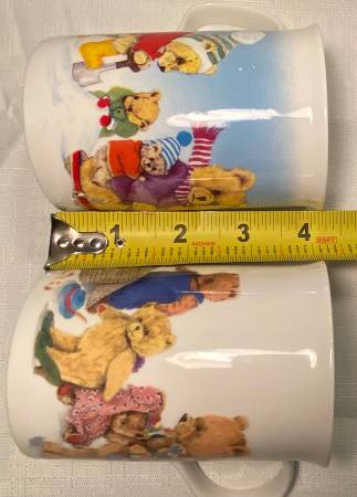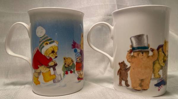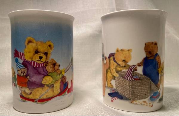 The product is a set of two vintage bone china bear mugs by Roy Kirkham and Royal Osborne, featuring a playful design of bears playing winter sports and bears playing dress-up. Manufactured in 1993 in England, these round medium-sized mugs are decorated with a multicolor pattern and suitable for both hot and cold beverages. The limited edition mugs are dishwasher safe and have handles, making them a charming addition to any kitchen or collectibles collection. Perfect for all occasions, these fine bone china mugs are a delightful representation of Teddy Bears At Play.