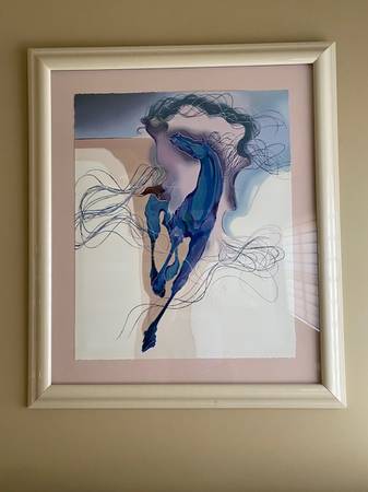 This original silkscreen is by Bonny and consists of a horse and rider imagery. The rider wears a robe and has long flowing hair. The horse also has long flowing hair. The piece creates a feeling of movement and fluidity that Bonny's work is so well known for. The horse is predominantly blues and purples. The rider's robe is pinks and mauves and the rider's face is a beige color.