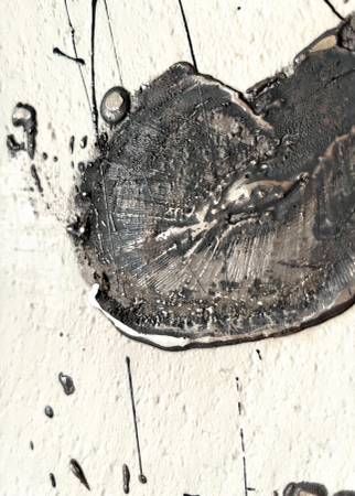 Stoneware and applied silver; embedded metal hanging feature on verso. Previous owner attached a plastic green loop, which I retained; however, the metal hanger works fine.