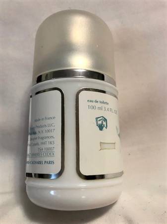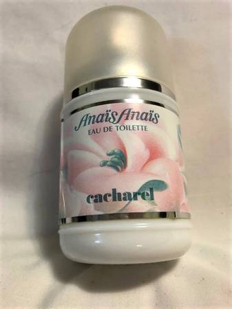 Anais Anais Eau de toilette by Cacharel spray bottle with a trace of perfume, 100 ml, 3.4 oz, 4 3/4" high, 1 3/4" diameter, some silver is worn off the inside top and the label is partially folded...