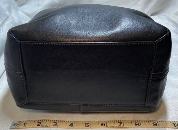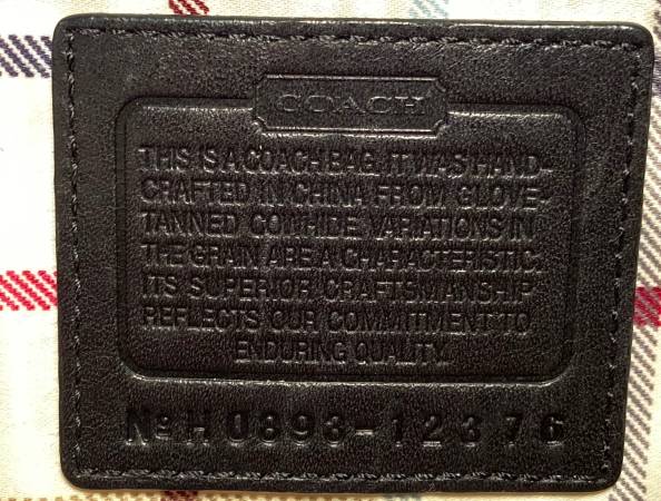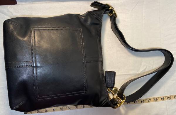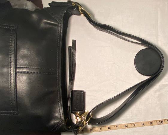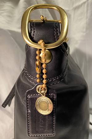 This Coach Large Black Leather Shoulder Bag is a rare and stylish piece with a rectangular shape and a zip closure. The bag features a black shoulder strap and polished brass hardware accents, including a buckle accent, outside and inside pockets, and a detachable bag charm. The interior is lined with a plaid fabric and includes additional inner and outer pockets for organization. This vintage piece from the Coach Legacy collection is perfect for various occasions such as travel, casual outings, workwear, or business meetings, adding a touch of designer flair to any outfit.