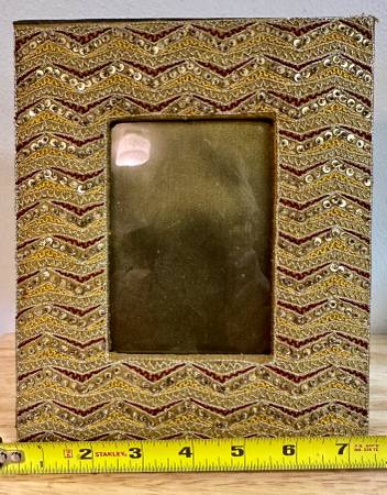 A decorative fabric photo frame with sequins and elegant embroidered design. The protective cover is not glass but a thin plastic sheet. A glossy photo might even look better if you don't use the plastic cover.