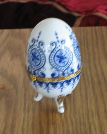 PORCELAIN EGG (FABERGE STYLE) Pretty blue design on white background, gilded metal strip at each opening edge. 4" high/ Jewelry of trinket box; unique "wrapper" for engagement ring presentation. $20. phone number please