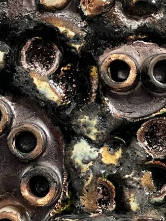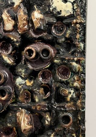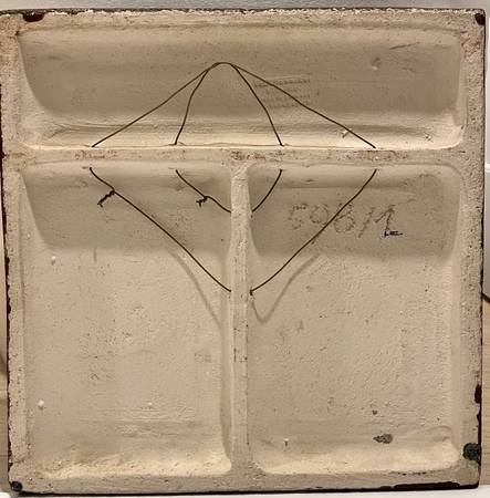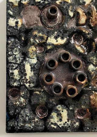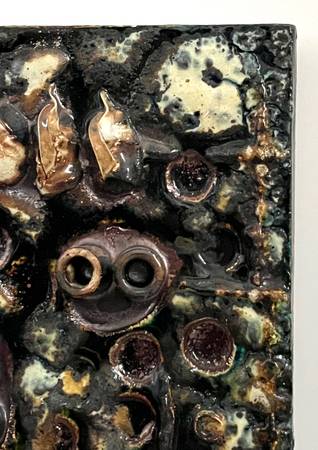 Condition: Very good, with the exception of one surface protuberance at the lower right that is temporarily attached with kneaded eraser (putty rubber) instead of conservation (the element came loose when it was shipped to me). However, since this is a modest work or art with intentional production irregularities, an improvised solution, like the current one, made economical and practical sense to me, including to stave off further vulnerability if it were permanently fixed in place. Conservation would cost more than the work itself and might not be a significant structural and visual improvement. In the final photograph in this listing, please see the medium gray putty where the base of pipe-like form meets the face of the relief.