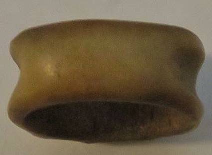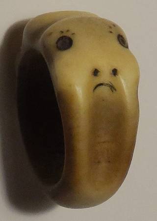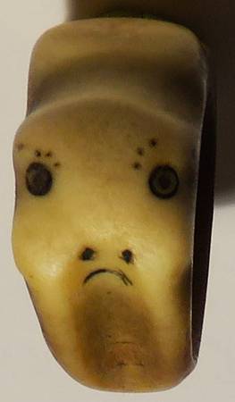 A Janus form, Inuit finger ring. Having a walrus head/tusks in relief, on either side. Facial features: eyes, brows, nostrils, mouth all incised with black pigment. Made of bone; circa 19th century....