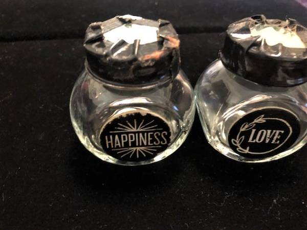 2 Love & Happiness glass jars, approximately 2" high, good condition, never-used
