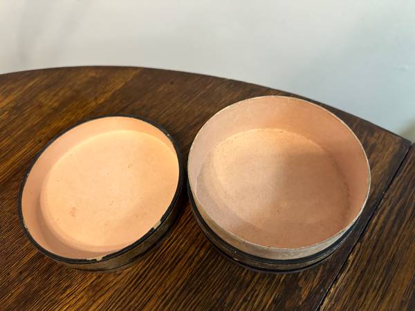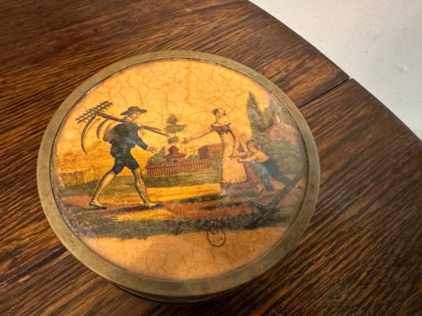 Lovely image, covered in plastic. Metal rims, tin binding. On the bottom is inscribed Tolmer, Paris. I have no idea what this originally contained, but it is nice. A little under 5" in diameter.