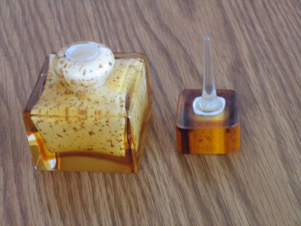PERFUME BOTTLE. vintage, thick yellow glass. applicator on lid. 2 1/2" x 2 1/2" x 3 3/4' high. $20 phone number please