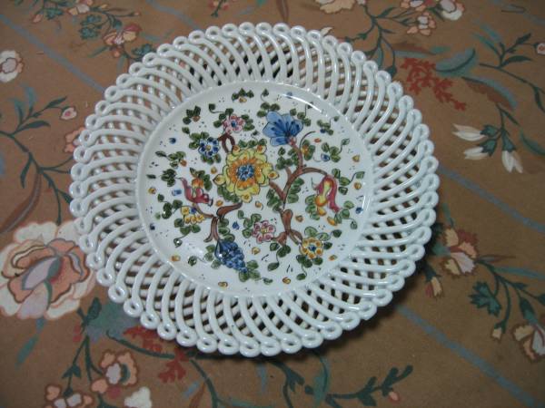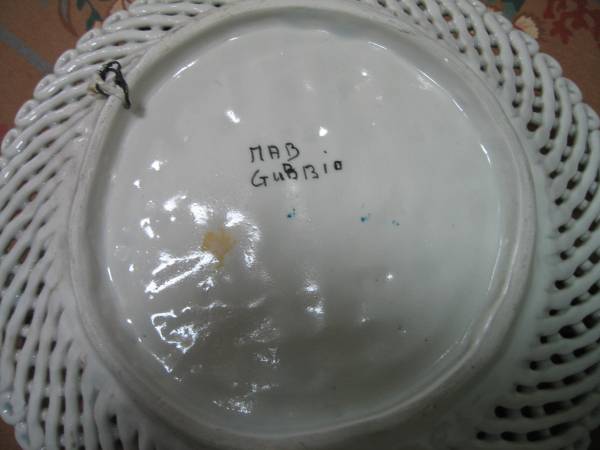 GUBBIO decorative wall platter, woven edge, signed. Beautiful and unusual rare and valuable signed GUBBIO wall platter woven edge work is unique to Gubbio works. Hanger on back. 9 1/2" diameter. White with cheerful floral. Signed MAD or MAB. $50. phone number please