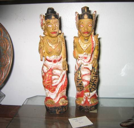 INDONESIAN or THAI possibly BALINESE male and female dancer figures. Carved wood; with red. black and gilding. Couple wears sarongs and jewelry with headdresses. Figures 7.5" high. $20 the pair. phone number please