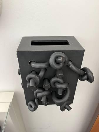 Presentation: This work is designed to be hung flush against the wall with a cleat, which would be provided. It also has inconspicuous feet at the bottom and could be displayed on a surface.