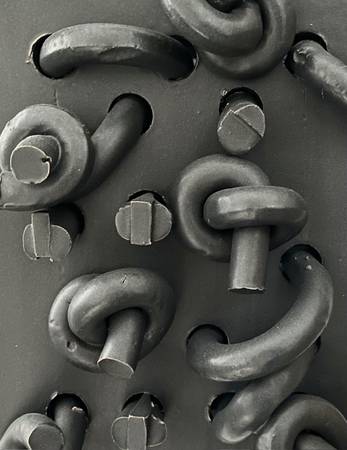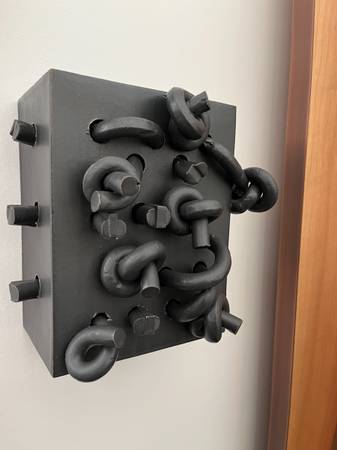 This installation comprises 25 cells that dramatize various facets of the prison industrial system, such as profiling, recidivism, and probation. Though clearly pertinent, and I’m not satiated with the latter subject as inspiration, this renewed series has given me scope to work more with the formal qualities of this “re-scripting the basic vocabulary of ceramics, slab construction and coils” (Adamson). Knot Stories are hanging wall sculptures and I find it thrilling that they are in conversation with painting, fiber works and text. My practices are back to a former balance and that I have more opportunities to share my ideas, as expressions and even catharsis, in slab form, the “principal” way I have expressed myself in clay over the years.