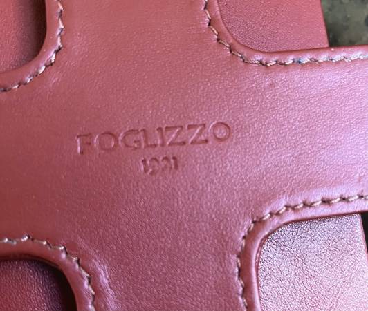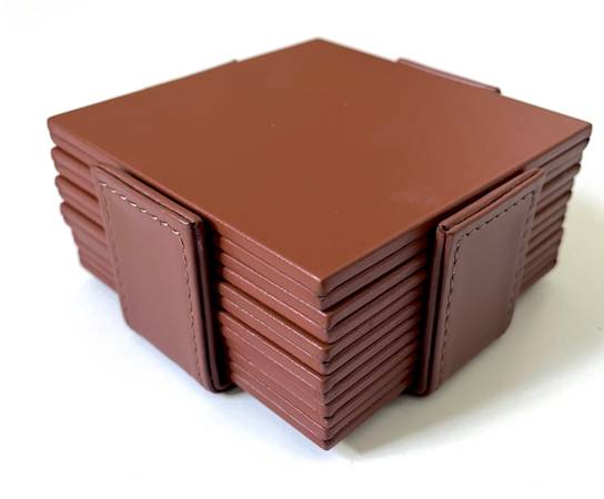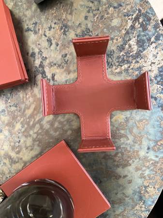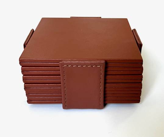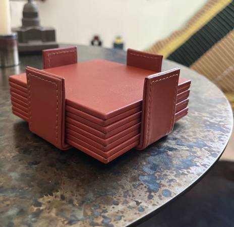 Foglizzo Bette Set of 6 Cognac Coasters with Case Stitched leather 2 x 4 x 4 in. ; height of each coaster: 1/4 in. Condition: Excellent No longer in production Tumblers in photograph are from...