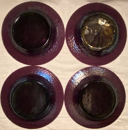 This product is a set of four Studio Bormioli Rocco Palatina hammered amethyst purple glass salad and soup bowls. Made in Italy, these round bowls have a glossy finish and a diameter of 8.5 inches. The mid-century modern style and decorative features make them suitable for all occasions, adding a touch of vintage charm to your dining experience. Hand wash only to preserve the original craftsmanship of these stackable and eye-catching pieces from the Rocco product line by Bormioli Rocco.