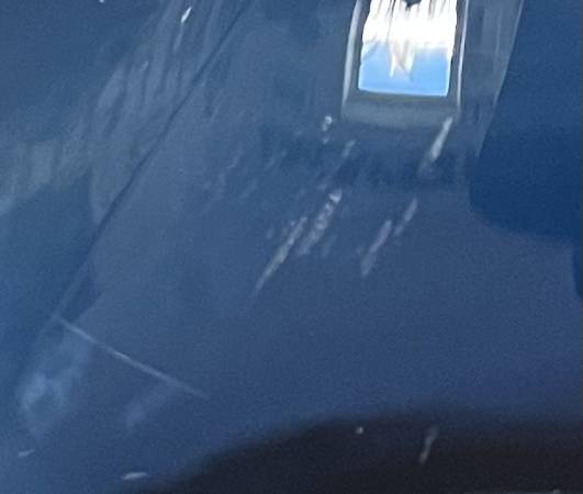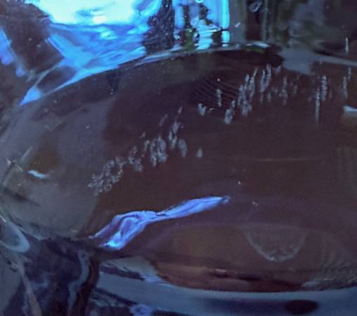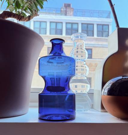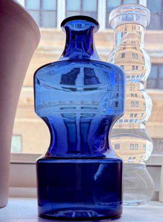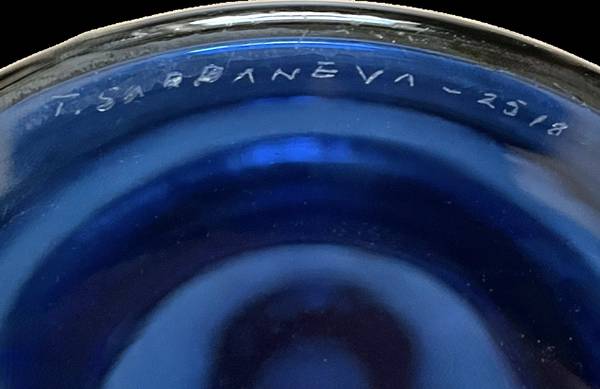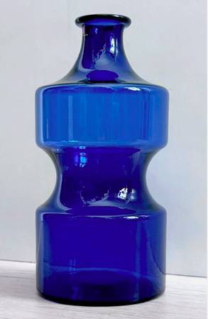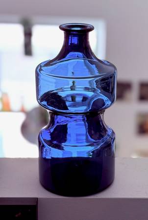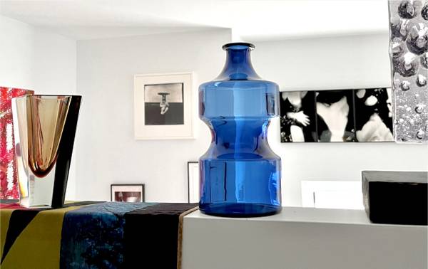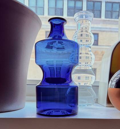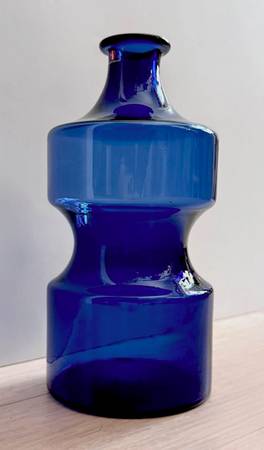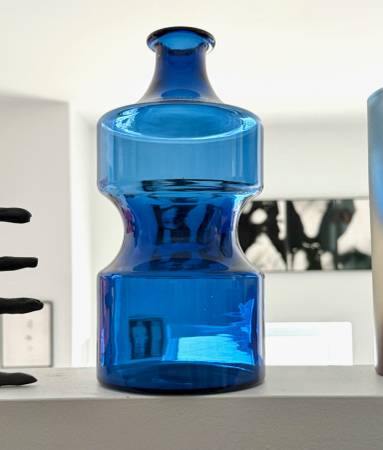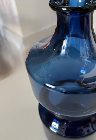 It has some minor production flaws and also surface scratches from use. There are some surface scratches below the neck on the top surface area. See last two photographs. (In the overall view, they appear at the center right. In the detail photograph, they are in the middle right below the window's reflection. The other light areas in the photograph are not scratches/abrasions. They are reflections within the space. An "Iittala" adhesive label remains at the edge of the neck but can easily be removed.