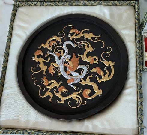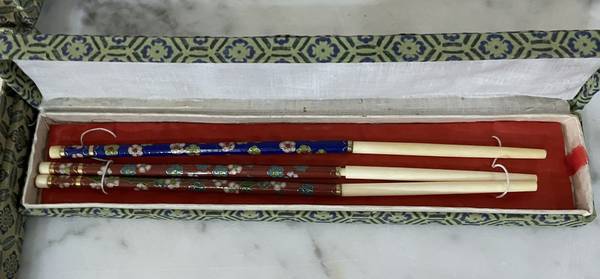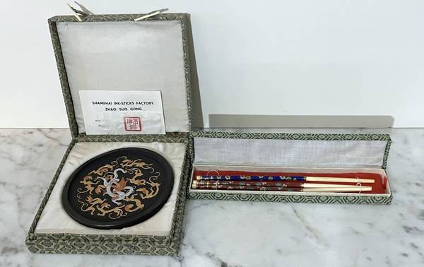 GROUP OF TWO VINTAGE CHINESE ITEMS - "DRAGON MEDALION" AND CLOISONNE CHOPSTICKS Size of "medalion": 5" diagonal Chopsticks: 8" 1/2 long CONDITION: In excellent condition Available for pickup only...