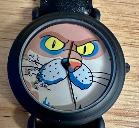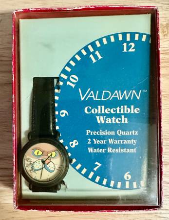 This is a Vintage Valdawn Digital Watch. Not sure if it works because it needs a new battery. Valdawn produced a lot of this type of watch with different cartoon characters adorning the watch face. I'm not sure who this cartoon cat is. Nor if the mice will move once a new battery is installed. Worth the price to find out? It sure is! Watch comes in original box, although the box top is missing.