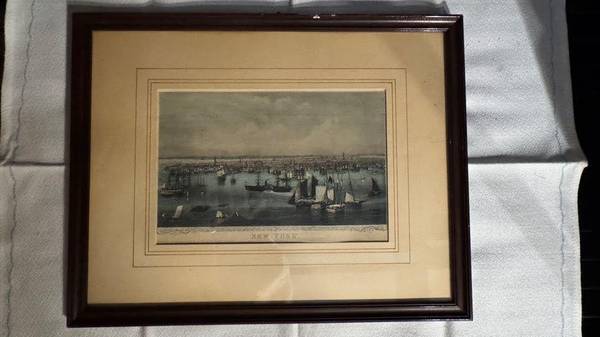 Vintage framed print of 19th-century New York Harbor, professionally framed by Philip Suval (NYC framer). Great vintage décor for office, hallway, or living room.