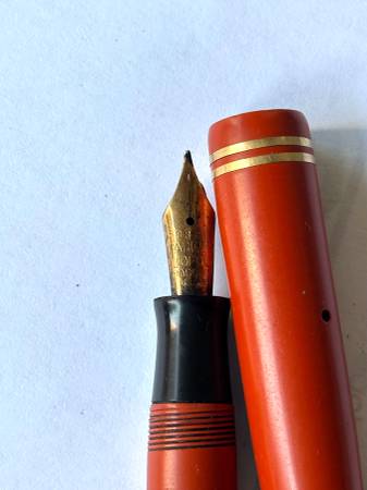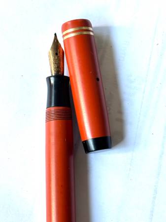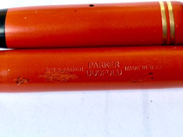 vintage Parker Duofold fountain pen, 4 3/4” long, has some ink marks and scratches, no clip. The nib is marked Parker Duofold Pen. It is being sold as is.
