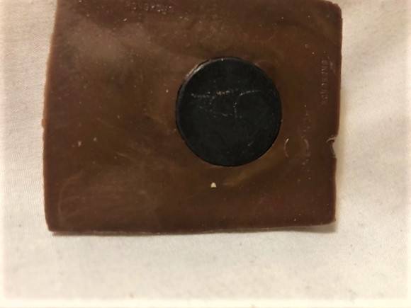 vintage refrigerator rubber magnet of chocolate bar, 2 1/4” by 1 13/16, has a small white mark