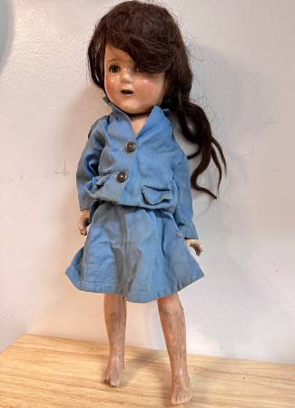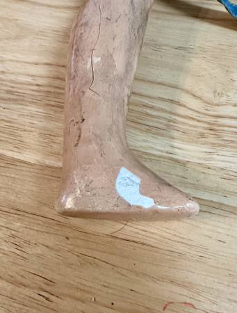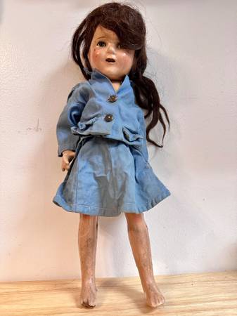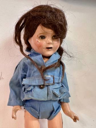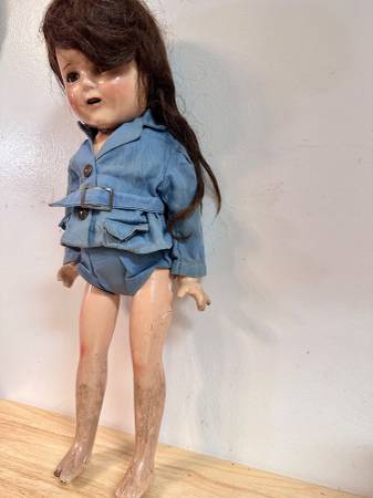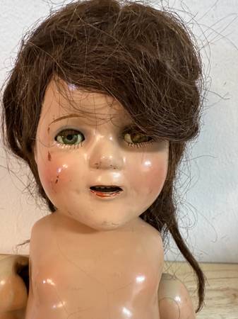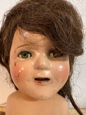 What is this doll made of? It seems like she has some kind of enamel skin that is peeling off some kind of white plaster base. Not sure what her hair is made of. Horsehair? Whatever she is made of, she will look spooky as hell hanging from your Halloween door. And you artists out there, I bet you could do wonders with her.