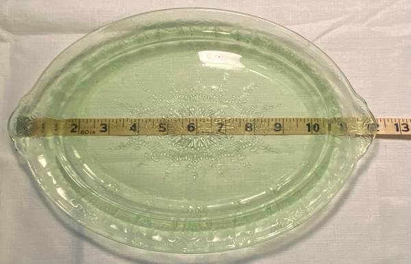 This Vintage Uranium Glass Cameo Ballerina Serving Platter is a stunning piece of American-made artistry from the 1930s. The oval shape, glossy finish, and decorative ballerina design make it a unique and eye-catching addition to any collection. The vibrant green color and Vaseline production style add to the allure of this original, vintage piece. With a diameter of 12 inches by 8 inches, this platter is perfect for serving or displaying, and is sure to be a conversation starter at any occasion.