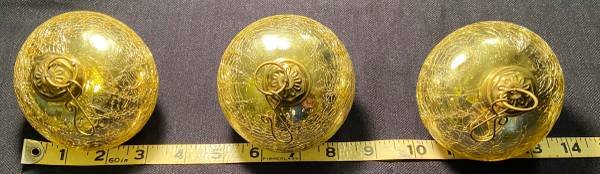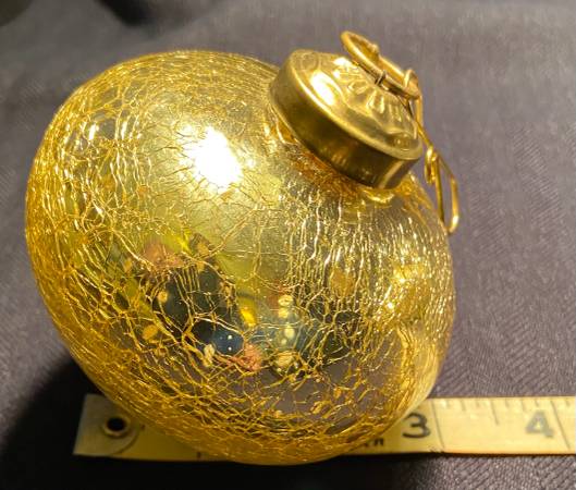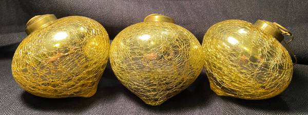 This product is a set of 3 vintage crackle mercury glass kugel style Christmas ornaments, each measuring 4 inches in size and featuring a gold color with an Art Deco style. These hand-blown glass ornaments are part of a collection of crackle mercury glass items, perfect for holiday decor for adults aged over 18 years. They come with a brass ring for easy hanging and are a charming addition to any Christmas tree, adding a touch of nostalgia and style to the festive season.