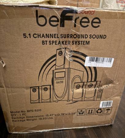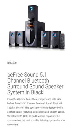 Enjoy the ultimate home theater experience with with beFree Sound's 5.1 Channel Surround Sound Bluetooth Speaker System. This speaker system is designed with sophistication, featuring a sleek look and smooth sound. With Bluetooth, USB, SD and FM radio capability, the system offers the best possible listening options for your enjoyment. Model 520
