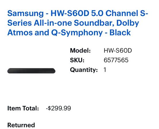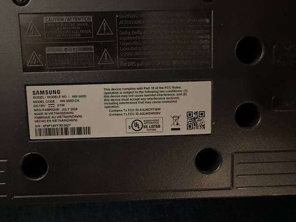 Samsung HW-S60D 5.0 Channel S-Series All-in-one Soundbar, Dolby Atmos and Q-Symphony - Black. Brand new and unused, with brackets, cords, etc. all in original wrapping but without box. Retail price...