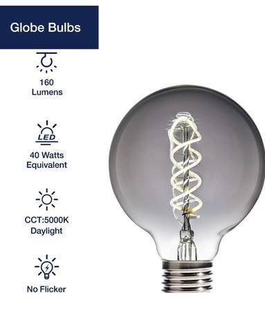 6 Pack - LED Light Bulbs, G25 Globe Decorative Smokey Grey Glass E26 Base, 4.5 Watts, 160 Lumens (40 Watt Equivalent), Dimmable, Spiral Filament, Instant On, 5000K