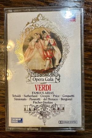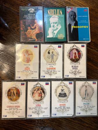 And what could be cooler than classical music on cassette. This is my mom's cassette collection. Mom loved opera, as you can see. I think the quality of these cassettes is pretty good, because mom mainly listened to them at home, not in a car. Sadly, I no longer own a cassette deck, so I have no way of listening to them and verifying their quality. So I offer you a money back quarantee on any that no longer play. In any case, you can't beat this price. $3 per cassette, or all 10 cassettes for $25!