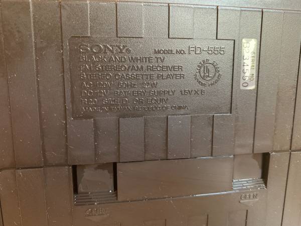 The Sony FD-555, also known as the Mega Watchman, is a portable entertainment system featuring a 4.5-inch black and white TV, an AM/FM radio, and a stereo cassette player. It has a telescoping antenna as well as a carrying handle that raises and lowers.