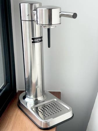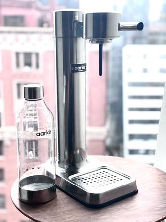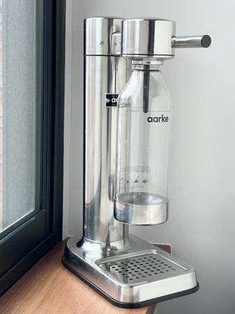Aarke sparkling water maker designed in Sweden is in excellent hardly used condition. Comes with 1 bottle show invoices and 1 empty refillable co2 cartridge.
