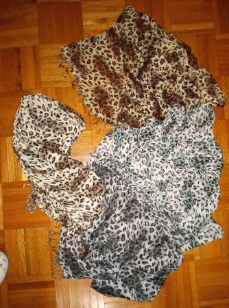 Assortment of Ladies Scarves $5 for EACH scarf Cash Only Solid Colors, Geometric Designs and Leopard Prints 13 Different Solid Colors: 64” (L) x 24” (W) (PHOTO 2) 9 Geometric Designs: 66” (L) x 10”...