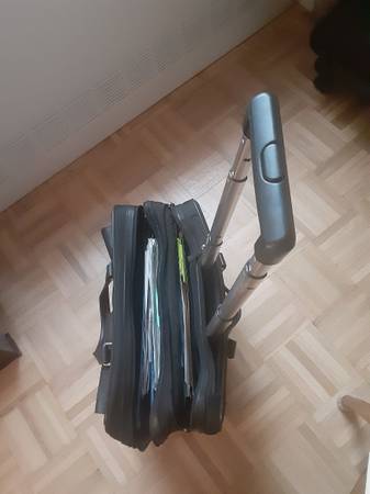 Back attachment allows piggy/backing on wheeled luggage handle.