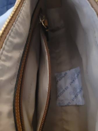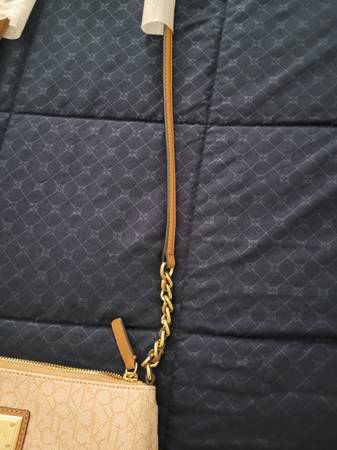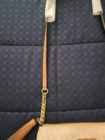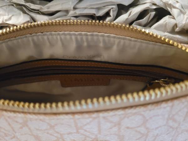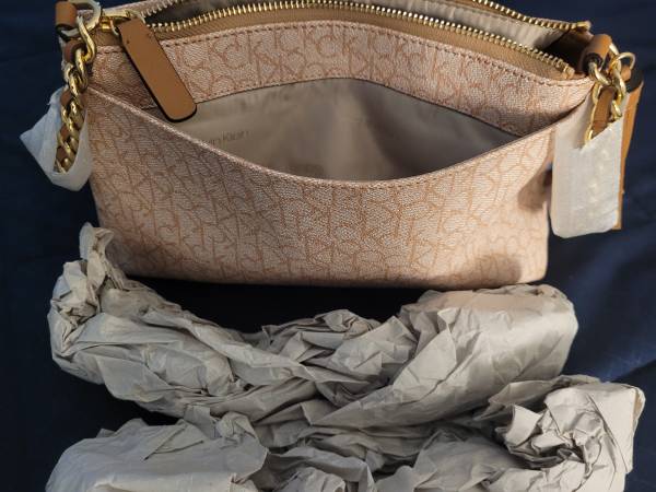 Moving sale item, 50% off for this Calvin Klein monogram crossbody bag new/unused condition protective covering still on strap and the inner paper protective stuffing is intact. Manmade material. Interior compartment plus one interior zippered compartment and one outer compartment.
